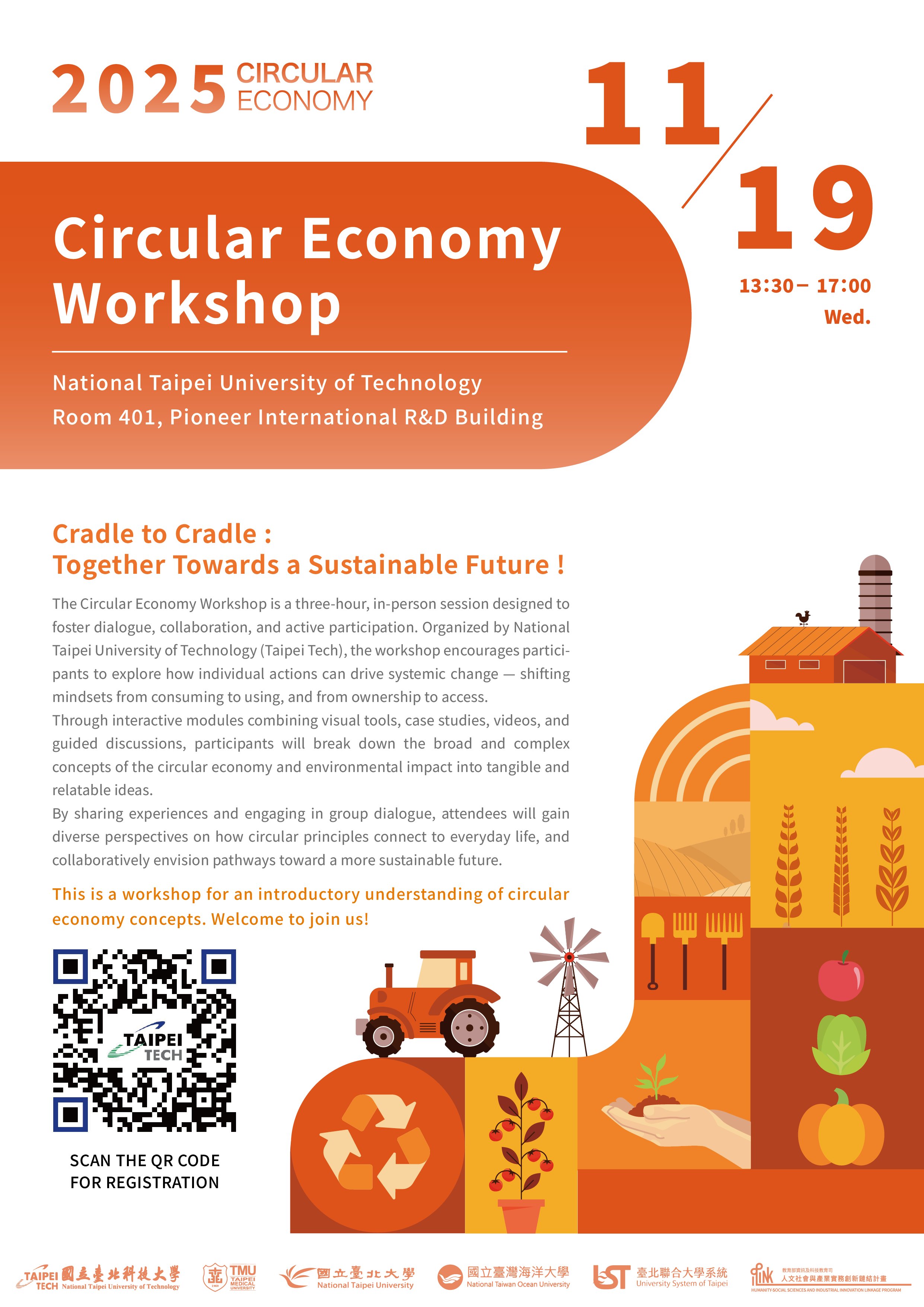 The Circular Economy Workshop is a three-hour, in-person session designed to foster dialogue, collaboration, and active participation. Organized by National Taipei University of Technology (Taipei Tech), the workshop encourages participants to explore how individual actions can drive systemic change — shifting mindsets from consuming to using, and from ownership to access.