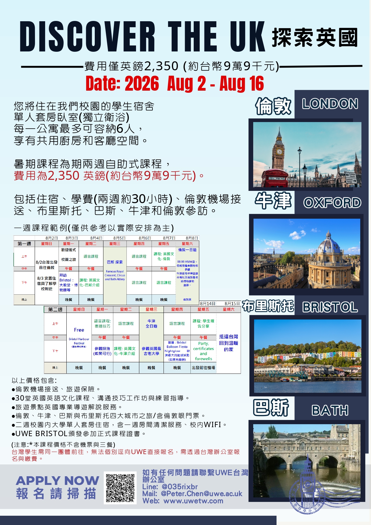 費用由 UWE 部分贊助,僅需 2,350 英鎊(約台幣 9萬 9 千元,未含機票、三餐)。