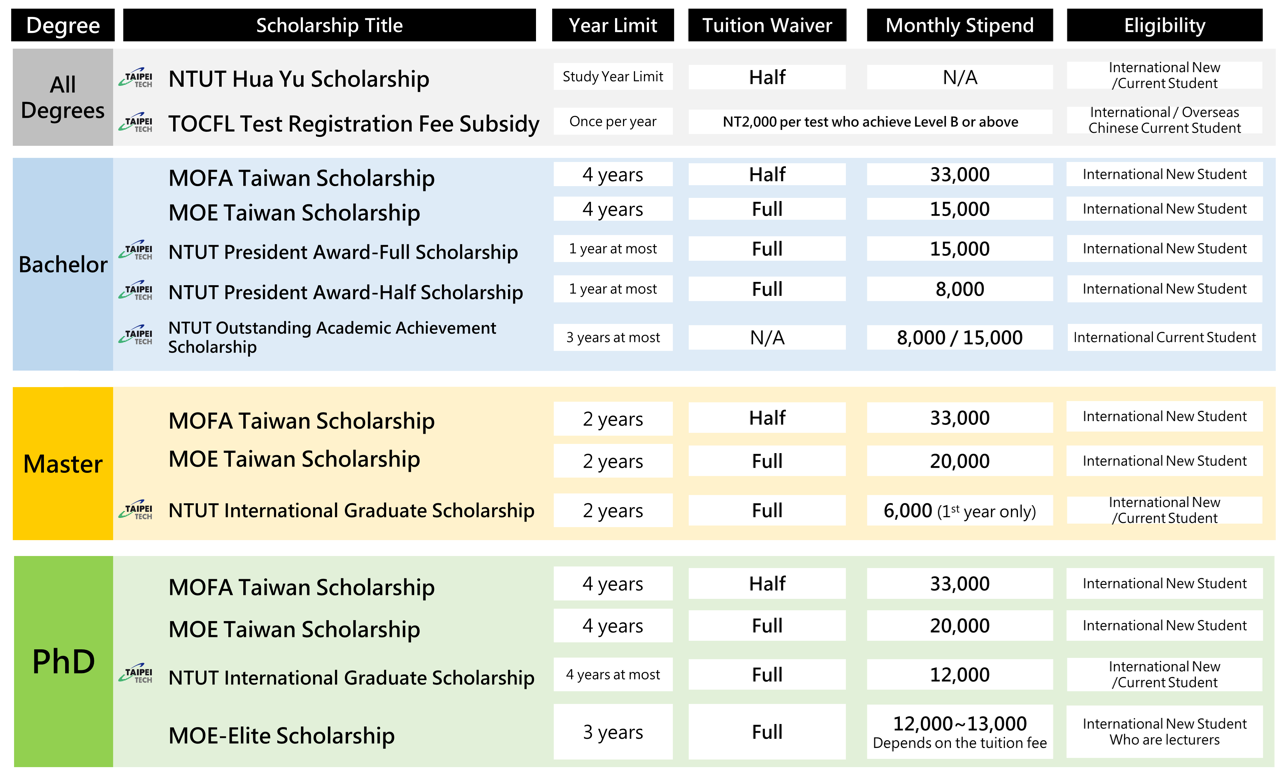 - Current international and overseas Chinese PhD students: reviewed by NTUT scholarship committee